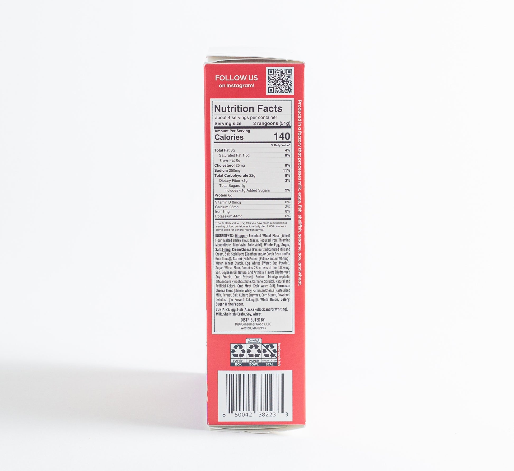 A delicious, crispy appetizer filled with a blend of creamy crab filling wrapped in a delicate wonton shell, perfect for snacking or sharing.